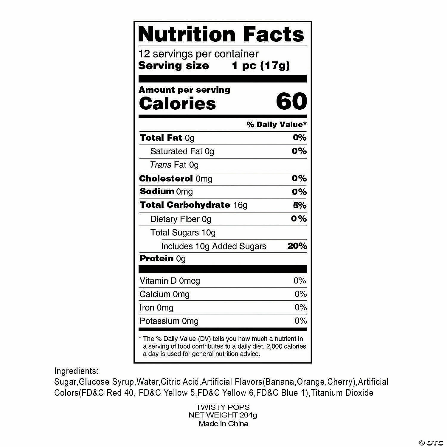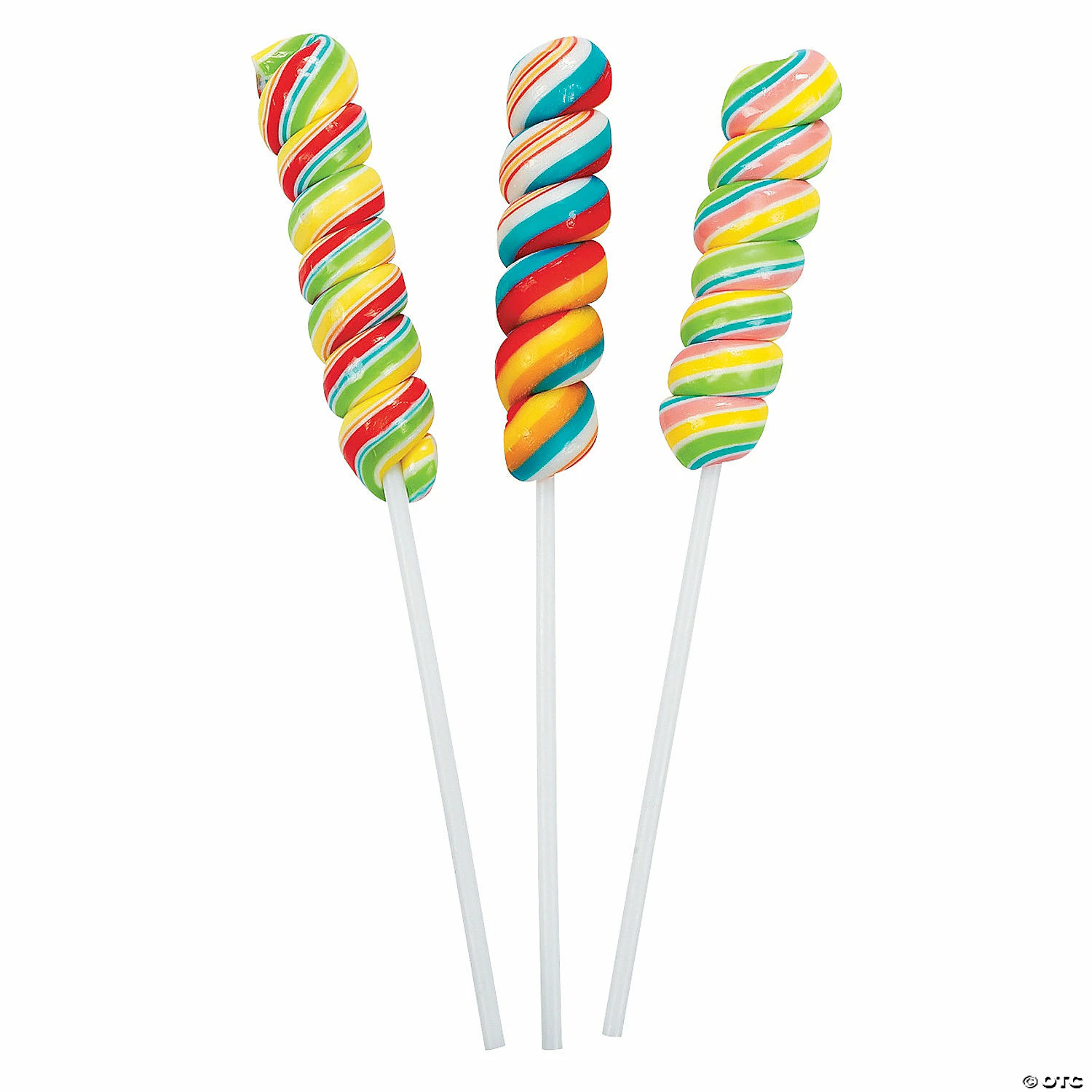 Twisted into fun lollipops bursting with fruity flavor, these sweet striped lollipops are perfect for any party or event! Thanks to their fun design and vibrant colors, these suckers double as party décor. Drop them into your party favor bags, candy buffet jars, or Halloween treat bags. Be sure to stock up on these candy favorites for your Trunk or Treat festivities, too! • Assorted fruit flavors • Individually wrapped. • Includes 3 1/2″ suckers on 2 1/4″ plastic sticks.• Total wt., 7 oz.• Assortment may vary. • Fat-free. • Candy is non-returnable. For more information, visit our “Return Policy” page located on our website.• Ingredient, nutrition, allergen and other product information are provided on our Web and Mobile sites for reference purpose only, without warranty or representation as to accuracy. Manufacturers adjust their labeling regularly and are solely responsible for the accuracy of the information. For general questions concerning these items, please contact our customer service at 800-228-0475.