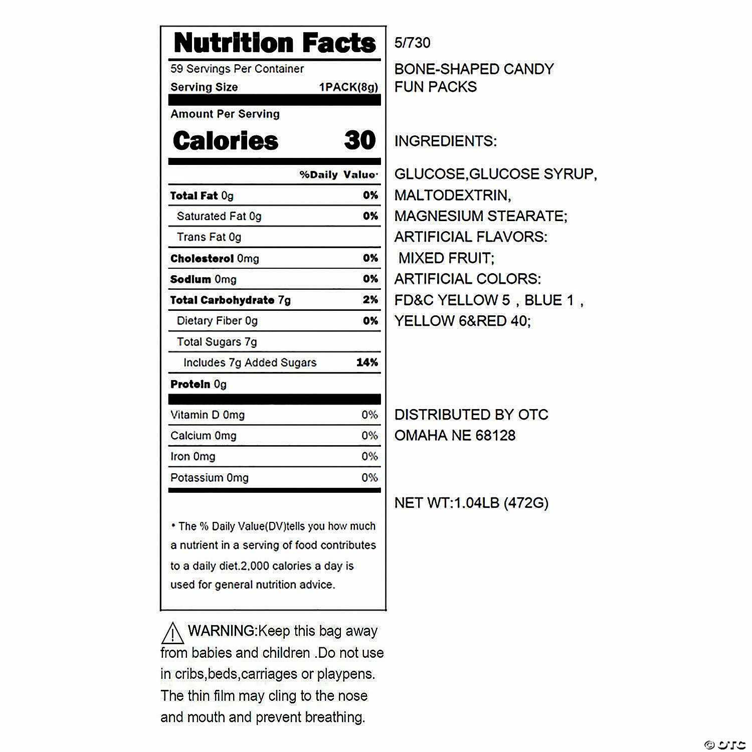 No bones about it, these assorted fruit-flavored skeleton candy packets are ideal for a variety of occasions! Drop them in trick-or-treat bags for some bone-chilling fun or add them to party favor bags. The perfect snack size for a little tasty treat after lunch or dinner! Shop even more Halloween candy and treats on our site. (Approx. 14 pcs. per pkg., 59 pkgs. per unit, 1 lb.) Fat-free. Nut-free. Gluten-free. Candy is non-returnable. For more information, visit our โReturn Policyโ page located on our website. โข Ingredient, nutrition, allergen and other product information are provided on our Web and Mobile sites for reference purpose only, without warranty or representation as to accuracy. Manufacturers adjust their labeling regularly and are solely responsible for the accuracy of the information. For general questions concerning these items, please contact our customer service at 800-228-0475.