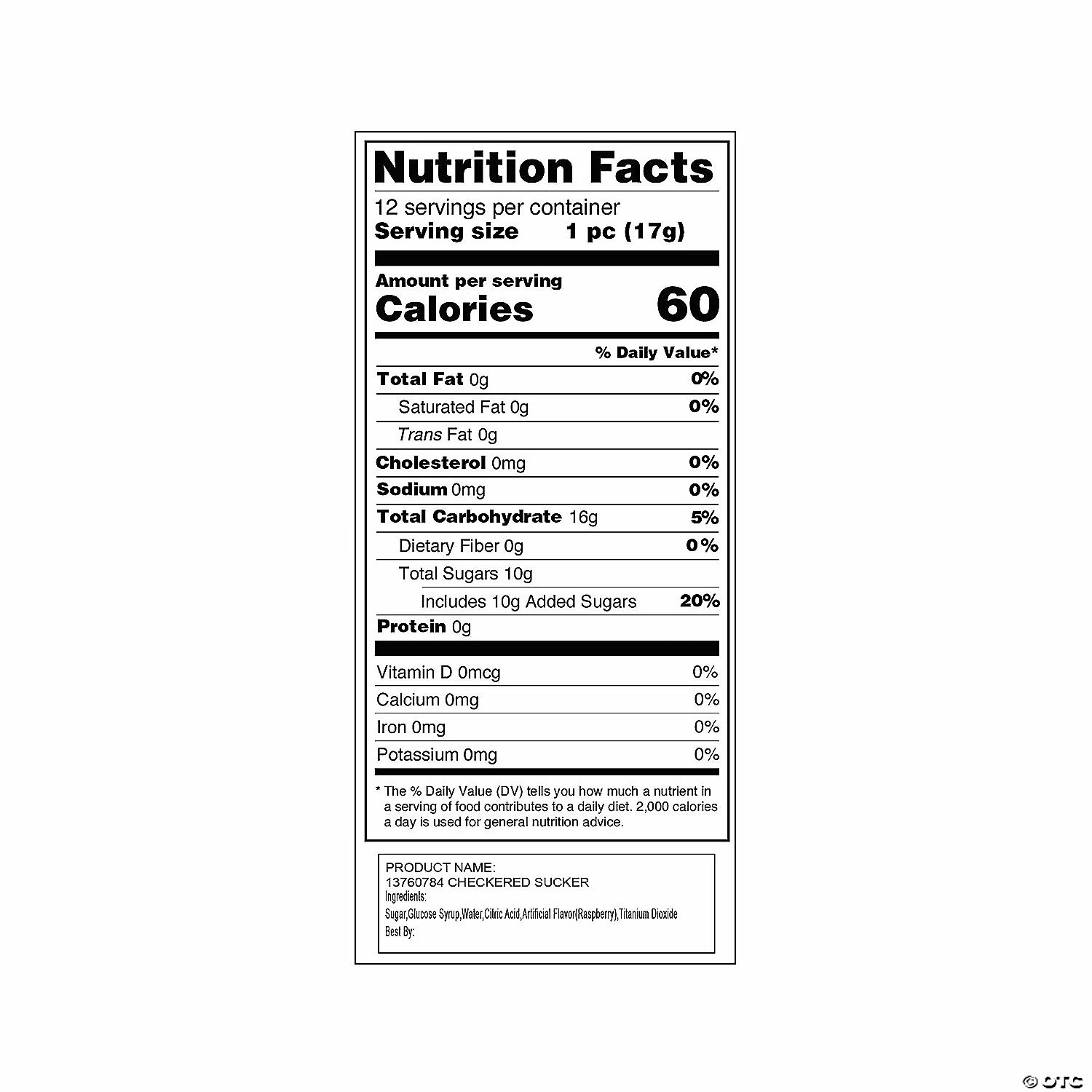 Make your racing party extra sweet with these checkered flag suckers. A tasty addition to your party supplies, these suckers are just the right size to hide in party favor bags for guests to take home. Or, include them in your candy buffet! 2″ suckers on a 4″ plastic stick. Raspberry flavor. Individually wrapped. Fat-Free. 7 oz. ยฉ OTCโข Candy is non-returnable. For more information, visit our โReturn Policyโ page located on our website. โข Ingredient, nutrition, allergen and other product information are provided on our Web and Mobile sites for reference purpose only, without warranty or representation as to accuracy. Manufacturers adjust their labeling regularly and are solely responsible for the accuracy of the information. For general questions concerning these items, please contact our customer service at 800-228-0475.