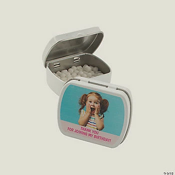 A simple thanks can go a long way, but your gratitude goes even further when you hand out these customized mint tins! Ideal party favors for birthday parties, graduations and other special occasions, these keepsake tins also make great thank-you gifts for weddings, end-of-year teacher gifts and any other event where attendees deserve an extra-special thanks. Personalize with 2 lines of text. Upload your own photo. Peppermint flavor. Metal. (Approx. 65 pcs. per tin; 2 dozen tins per unit) 2 1/2″ Total wt., 11 oz. Fat-Free. Gluten-free. Β© OTC