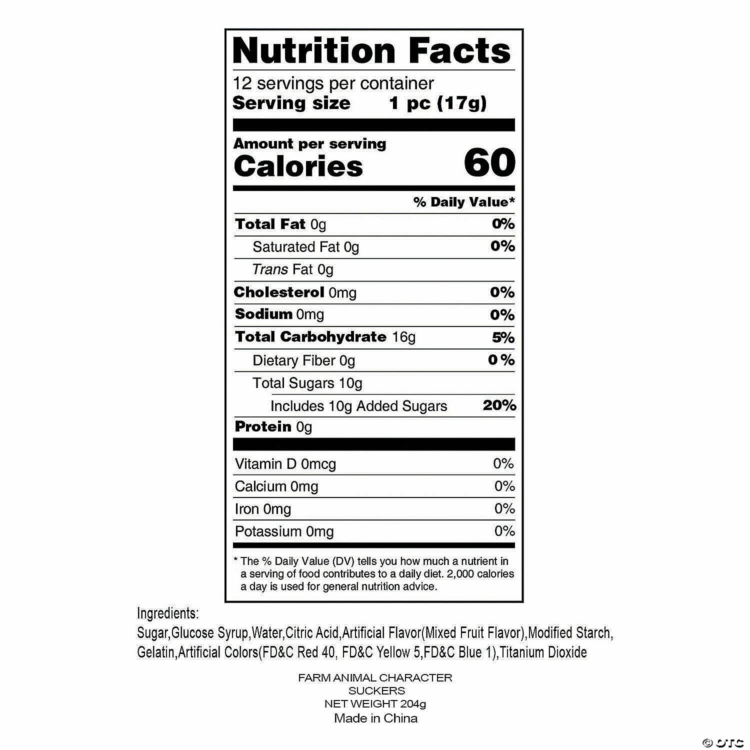 Old Macdonald had a farm, and on his farm he had some lollipops! A adorable assortment of chicken, pig, cow and horse shaped suckers, these candies make kids smile! Use these fruity suckers to celebrate school field trips to the farm or enjoy during barnyard theme birthday parties. © OTC• Mixed fruit flavored.• Individually wrapped. • Includes 2″ suckers on 4″ plastic sticks.• Total wt., 7 oz. • Assortment may vary. • Fat-free. • Candy is non-returnable. For more information, visit our “Return Policy” page located on our website.• Ingredient, nutrition, allergen and other product information are provided on our Web and Mobile sites for reference purpose only, without warranty or representation as to accuracy. Manufacturers adjust their labeling regularly and are solely responsible for the accuracy of the information. For general questions concerning these items, please contact our customer service at 800-228-0475.