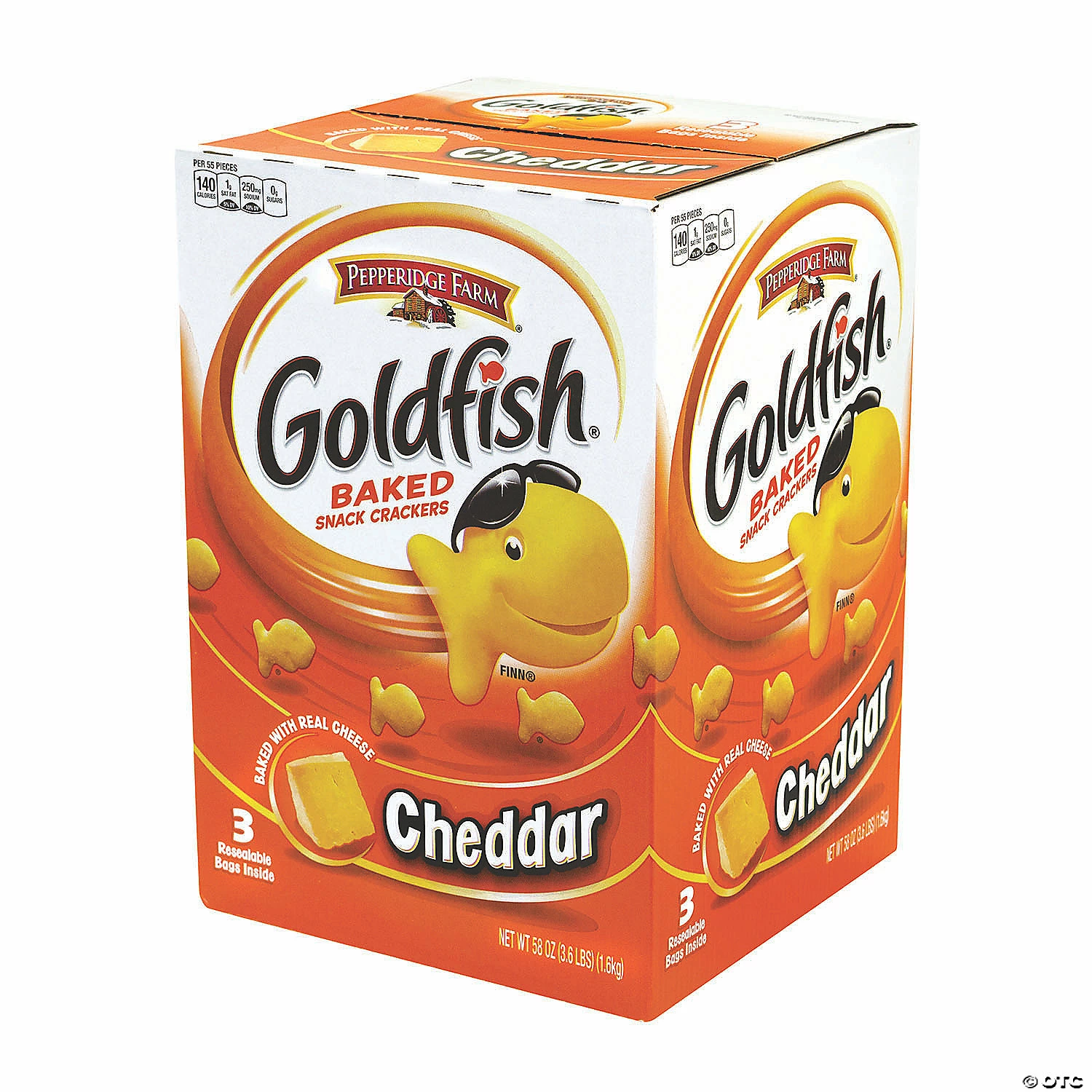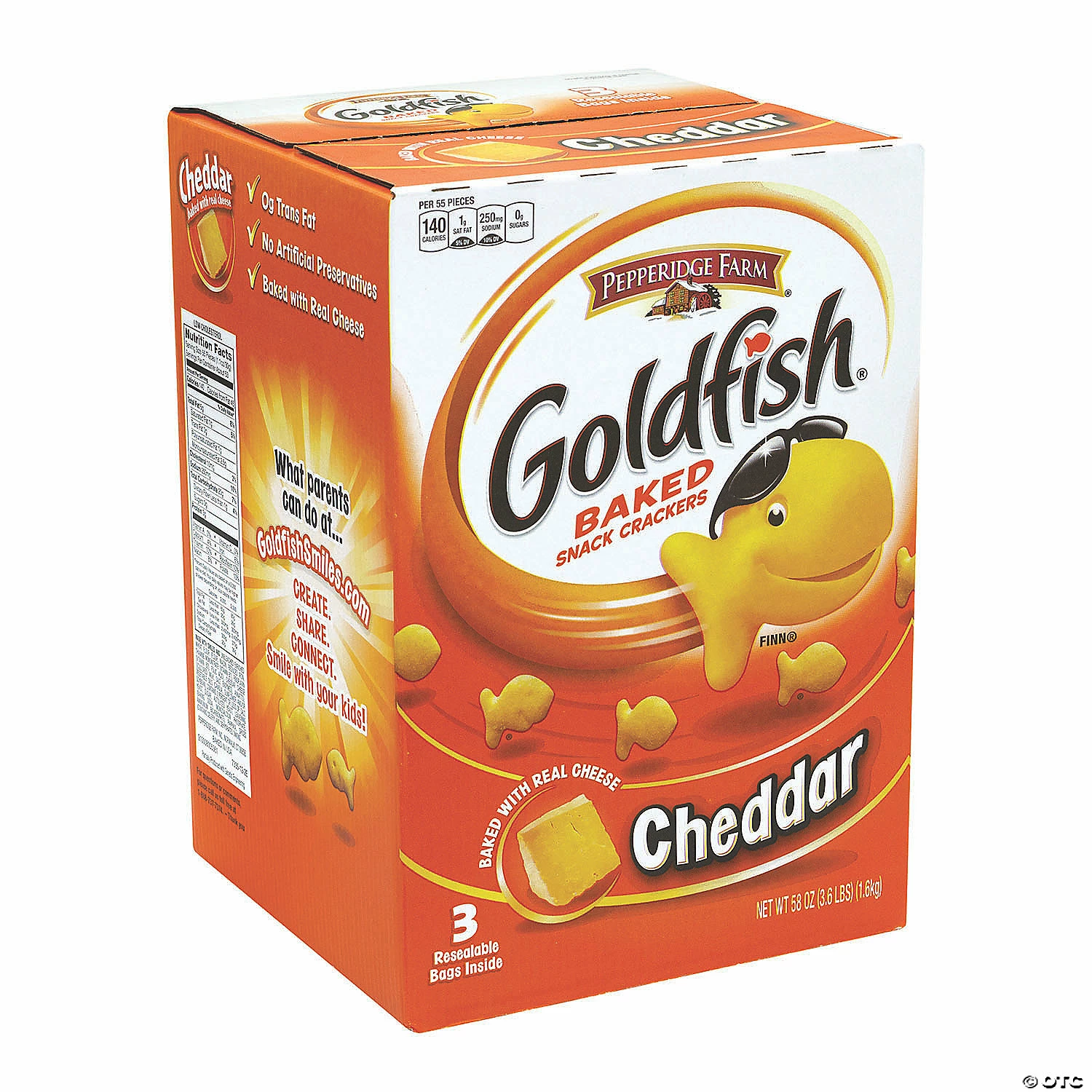 Everyone loves Goldfish crackers – they’re tasty and fun! With a large 56oz carton you can always come back for more, or have enough to feed a crowd. When it comes to Goldfish crackers, you can feel good about serving your favorite snacks. All of our cheese varieties, like cheddar, are baked with real cheese, and Goldfish crackers are always baked, free of artificial preservatives or flavors and a good source of fun. The 56oz carton is also available in Baked with Whole Grain Cheddar – made with 12g of whole grain per serving. Edibles are non-returnable. For more information, visit our “Return Policy” page located on our website.