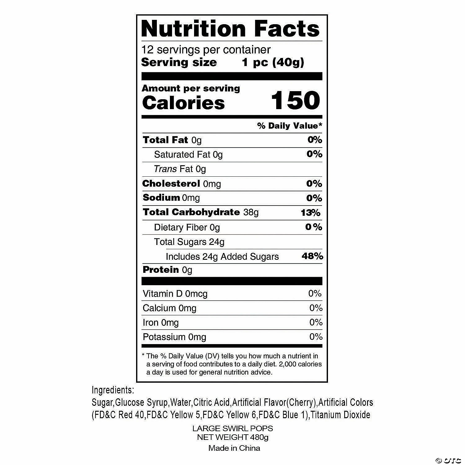 • What’s Included: You get 12 large, individually wrapped rainbow swirl lollipops in cherry flavor. • Non-Returnable: Candy is non-returnable. For more information, visit the Return Policy page located on our website.• Important Country of Origin Information: For certain items sold by OTC on our Web or Mobile sites, country of origin information can change and what is displayed may not be accurate or consistent with manufacturer information. For up to date country of origin information, it is recommended that you rely on product packaging or other manufacturer information.• Product Information: These swirled lollipops are fat-free. Details about ingredients, nutrition, allergens and other product information are provided on our Web and Mobile sites for reference purpose only, without warranty or representation as to accuracy. Manufacturers adjust their labeling regularly and are solely responsible for the accuracy of the information. For general questions concerning these items, please contact our customer service at 800-228-0475.Product Description: Sweet nostalgia! Bright rainbow colors give these large swirl lollipops their old fashioned charm. While the cherry flavor is tasty, these lollipops are big on style. They’ll draw everyone’s eye when you use them as sweet decorations in glass jars on the candy buffet at your wedding reception, carnival birthday party or circus-themed corporate event. You get a dozen individually wrapped large lollipops on plastic sticks. Your guests will love them! Specs:Size: 2 3/4″ lollipop, 6″ stickQuantity: 1 lb., 12 lollipopsDietary needs: Fat-free