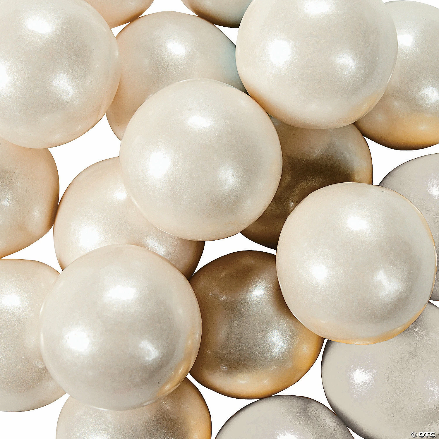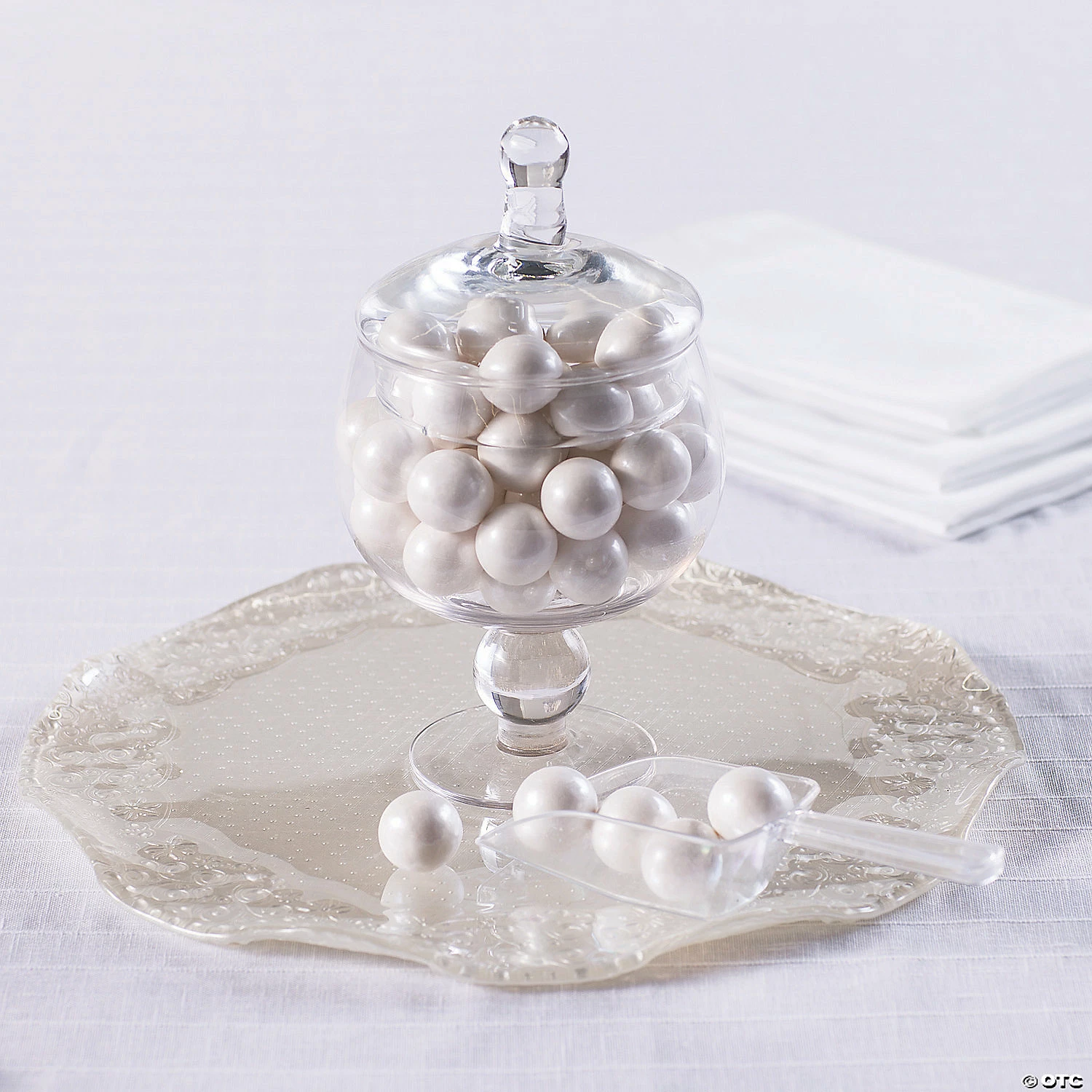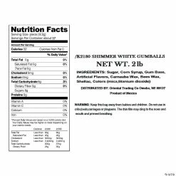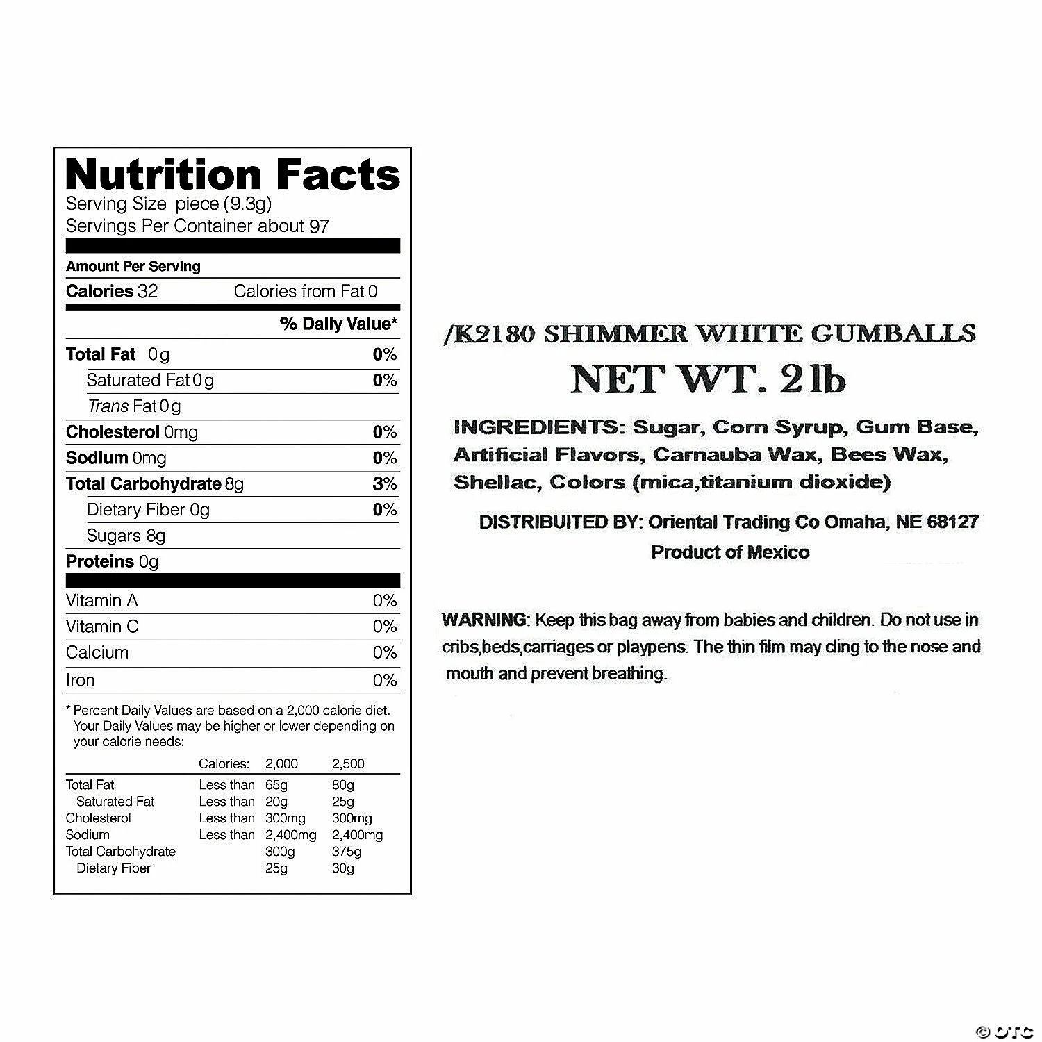 • What’s Included: This set includes approximately 105-120 large shimmer white gumballs in a fun tutti-fruitti flavor. • Non-Returnable: Candy is non-returnable. For more information, visit the Return Policy page located on our website.• Important Country of Origin Information: For certain items sold by OTC on our Web or Mobile sites, country of origin information can change and what is displayed may not be accurate or consistent with manufacturer information. For up to date country of origin information, it is recommended that you rely on product packaging or other manufacturer information.• Product Information: The gumballs are fat-free. Details about ingredients, nutrition, allergens and other product information are provided on our Web and Mobile sites for reference purpose only, without warranty or representation as to accuracy. Manufacturers adjust their labeling regularly and are solely responsible for the accuracy of the information. For general questions concerning these items, please contact our customer service at 800-228-0475.Product Description: Sweet shimmery elegance! These shimmer white large gumballs will help create your dream wedding reception candy buffet a reality. See how beautiful these gumballs look when displayed in glass jars of various sizes and complemented by other candies like rock candy on a stick. Not just for bridal showers and wedding receptions, these shimmer white gumballs are also brilliant for coordinating your holiday parties and white gala events where everyone is dressed in white. Specs:Size: 2 lbs.Quantity: Approximately 105-120Dietary needs: Fat-freeBrand: © OTC – Oriental Trading Company