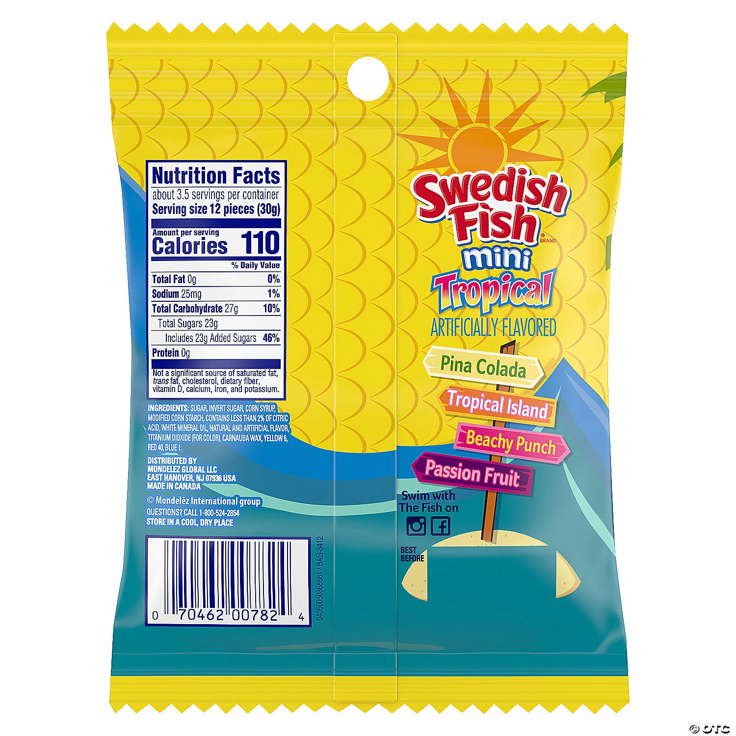 Make a splash at your next beach-themed party or event with these fruity candies! The fan-favorite Swedish Fish is now mini-sized and comes with a variety of tropical-infused flavors. Dump a batch of these into a fishbowl and display it in your candy bar or on a party table as a fun centerpiece. Pina colada, tropical island, beachy punch and passion fruit flavors. (12 pkgs. per unit) Bag, 5 1/4″ x 6 1/2″. Individually packaged. Fat-free. Dairy-free. Nut-free. Total wt., 43.2 oz.• Candy is non-returnable. For more information, visit our “Return Policy” page located on our website. • Ingredient, nutrition, allergen and other product information are provided on our Web and Mobile sites for reference purpose only, without warranty or representation as to accuracy. Manufacturers adjust their labeling regularly and are solely responsible for the accuracy of the information. For general questions concerning these items, please contact our customer service at 800-228-0475.