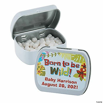 The baby’s almost here; it’s time to go wild! Celebrate with a Jungle Baby Animals theme, and hand out these customized mint tins as baby shower party favors and giveaways. When your little one arrives, give these tins away as gifts for those who visit at the hospital! Personalize with two lines of text. Peppermint flavor. (Approx. 65 pcs. per tin; 2 dozen tins per unit) 2 1/2″ tins. Total wt., 11 oz. Fat-free. Gluten-free. ยฉ OTC