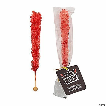 Rock out to some beats while enjoying this sweet treat! This kit features classic rock candy pops and a card pre-printed with โLetโs Rockโ, making it the perfect party favor for a rock star or rock โn roll-themed party or event. Hand one out to each party guest or place them in goody bags from this website. Customize by adding the event name or any other special message. Includes 2″ x 2″ cardstock cards and gold metallic twist ties. Personalize with 2 lines of text. Each 4 1/2″ sucker is on a 3″ wooden stick. Strawberry flavor. Individually wrapped. Dairy free. Fat-free. Gluten free. Total wt., 9 oz. Simple assembly required. ยฉ OTC