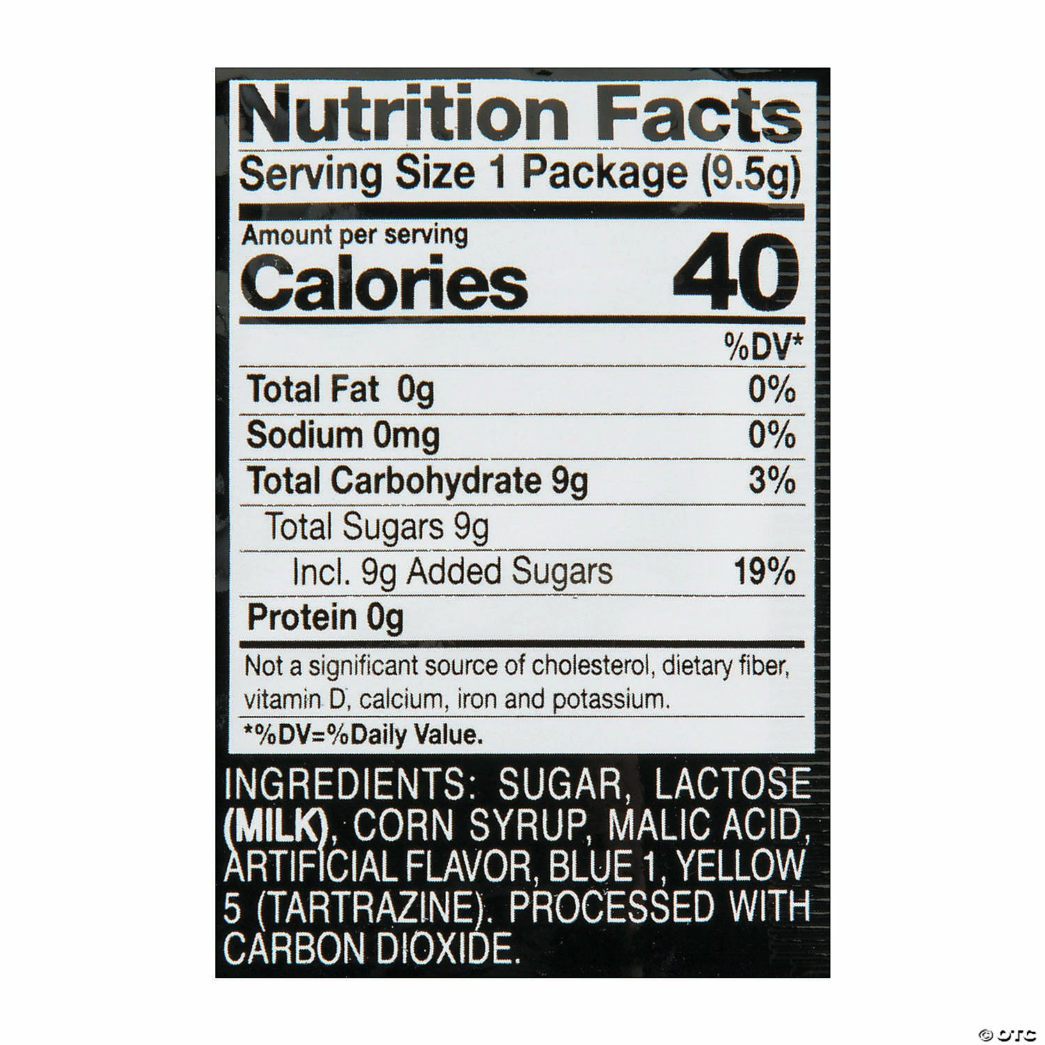 Get ready for a pop of flavor! A must-have for birthday party favors, these fun candy packs really taste like green apple. You can also use these to sweeten up your candy selection at celebrations for Halloween, Christmas, Easter and in the classroom. For more flavors and tasty treats, just shop this site! Green apple flavor. (24 pcs. per unit) Total wt., 7 oz. Fat-free.• Candy is non-returnable. For more information, visit our “Return Policy” page located on our website.• Ingredient, nutrition, allergen and other product information are provided on our Web and Mobile sites for reference purpose only, without warranty or representation as to accuracy. Manufacturers adjust their labeling regularly and are solely responsible for the accuracy of the information. For general questions concerning these items, please contact our customer service at 800-228-0475.