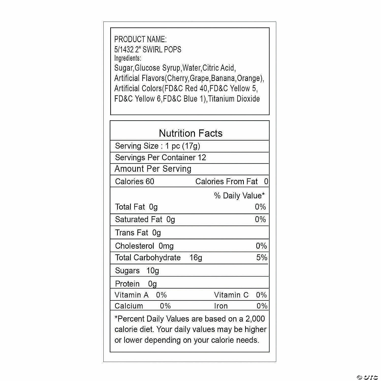 These eye-catching lollipops make a whimsical addition to your party favor bags. Drop these swirly suckers into trick-or-treat bags and be the best stop on the block, or add a sweet (lolli)pop of vibrant color to your candy buffet table! The classic swirled lollipop shape is sure bring back childhood memories. © OTC• Cherry, orange, grape and banana flavored.• Individually wrapped.• (2 dozen per unit) • Includes 2″ suckers on 3 1/2″ plastic sticks.• Total wt., 14 oz. • Assortment may vary. • Fat-free. • Candy is non-returnable. For more information, visit our “Return Policy” page located on our website.• Ingredient, nutrition, allergen and other product information are provided on our Web and Mobile sites for reference purpose only, without warranty or representation as to accuracy. Manufacturers adjust their labeling regularly and are solely responsible for the accuracy of the information. For general questions concerning these items, please contact our customer service at 800-228-0475.