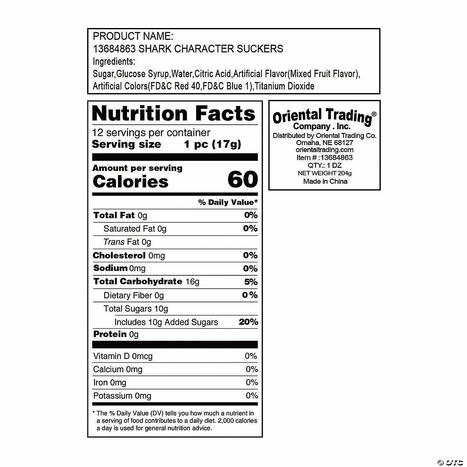 Kids will love chomping on these adorable mixed-fruit flavored suckers. Add these yummy lollipops to your luau, beach party or shark party favor bags to make a sensational splash! Includes 6 shark heads and 6 fins with shark designs on the wrappers. Individually wrapped. 2″ pops on 4″ plastic sticks. Fat-free. Total wt. 7 oz. © OTC• Candy is non-returnable. For more information, visit our “Return Policy” page located on our website.• Ingredient, nutrition, allergen and other product information are provided on our Web and Mobile sites for reference purpose only, without warranty or representation as to accuracy. Manufacturers adjust their labeling regularly and are solely responsible for the accuracy of the information. For general questions concerning these items, please contact our customer service at 800-228-0475.