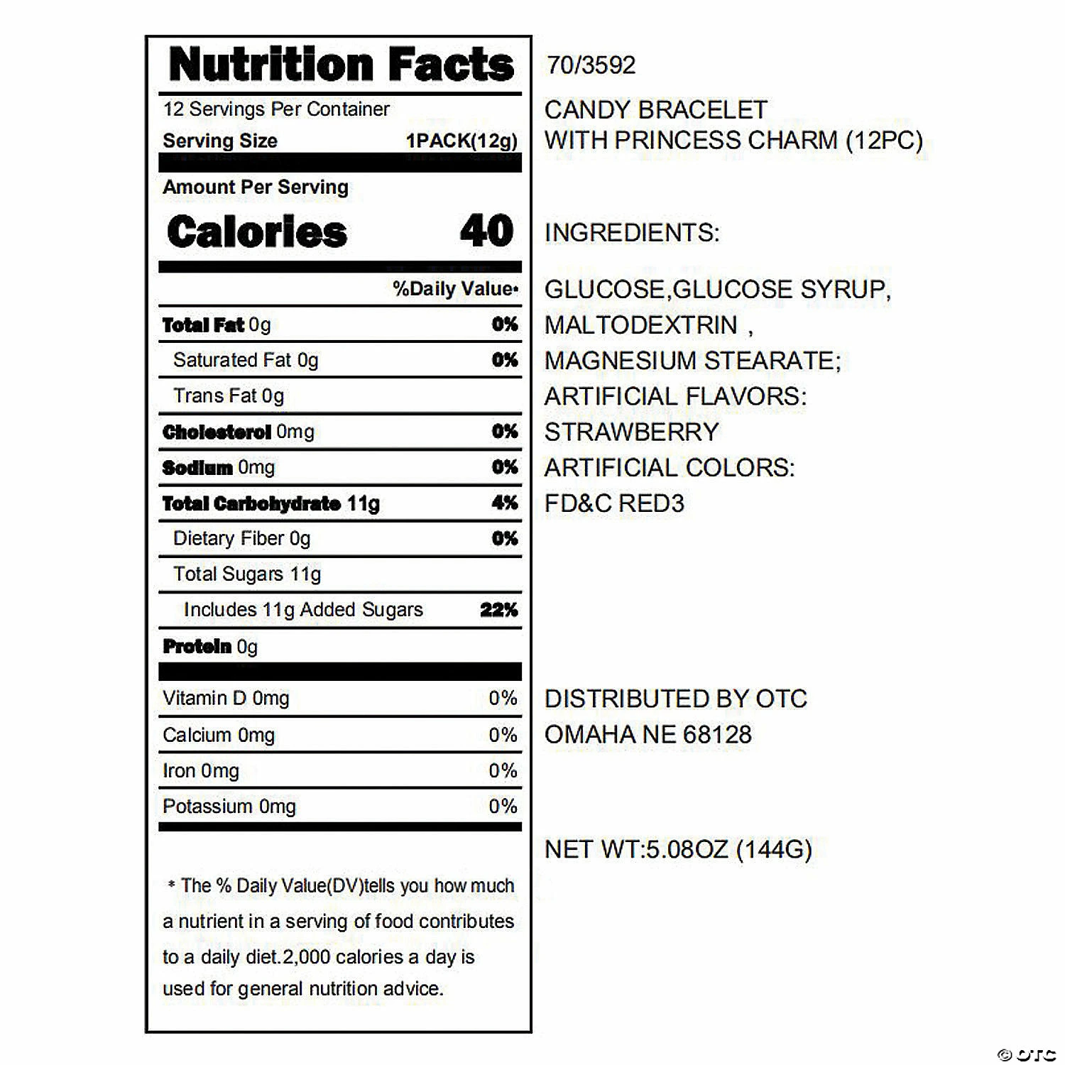 Treat your little princesses to these fun candy bracelets. A sweet addition to your party supplies, these Stretchable Candy Bracelets with a Princess Charm are perfect for treat bags and candy buffets for your princess-themed party. © OTC• Strawberry flavor.• Individually wrapped.• Size: 2 1/2″ with a 1″ tiara charm.• Total wt., 5 oz.• Fat-free.• Candy is non-returnable. For more information, visit our “Return Policy” page located on our website.• Ingredient, nutrition, allergen and other product information are provided on our Web and Mobile sites for reference purpose only, without warranty or representation as to accuracy. Manufacturers adjust their labeling regularly and are solely responsible for the accuracy of the information. For general questions concerning these items, please contact our customer service at 800-228-0475.