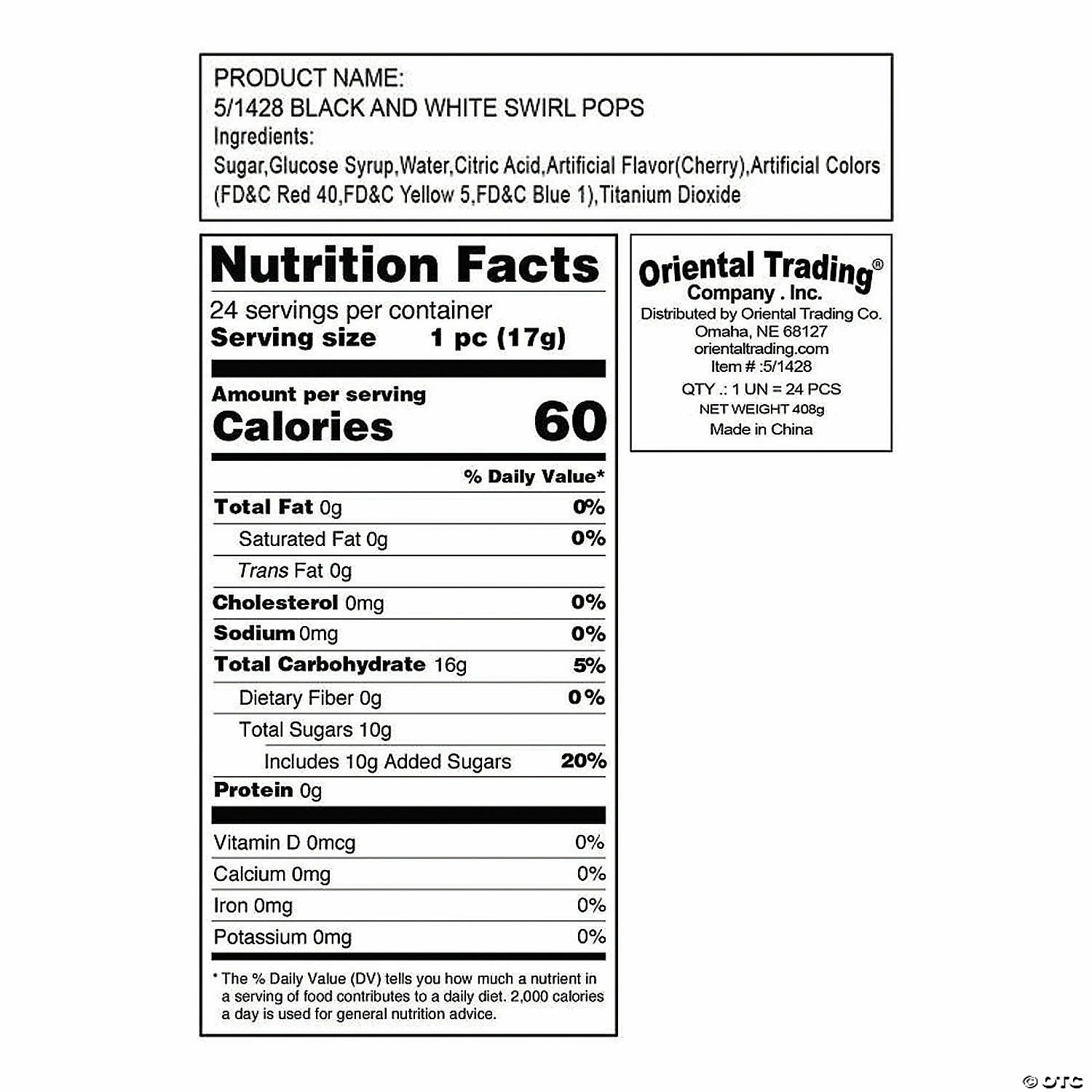These suckers are a great treat to have around during wedding receptions, birthday parties, carnivals, fundraisers or wherever you need to brighten up your treat table or candy buffet! Sweet, tasty fun for both kids and adults! Cherry flavor. Individually wrapped. Each 2″ pop is on a 4 1/2″ plastic stick. (2 dozen per unit) Total wt., 14 oz. Fat-free. Gluten-free. ยฉ OTCโข Candy is non-returnable. For more information, visit our โReturn Policyโ page located on our website.โข Ingredient, nutrition, allergen and other product information are provided on our Web and Mobile sites for reference purpose only, without warranty or representation as to accuracy. Manufacturers adjust their labeling regularly and are solely responsible for the accuracy of the information. For general questions concerning these items, please contact our customer service at 800-228-0475.