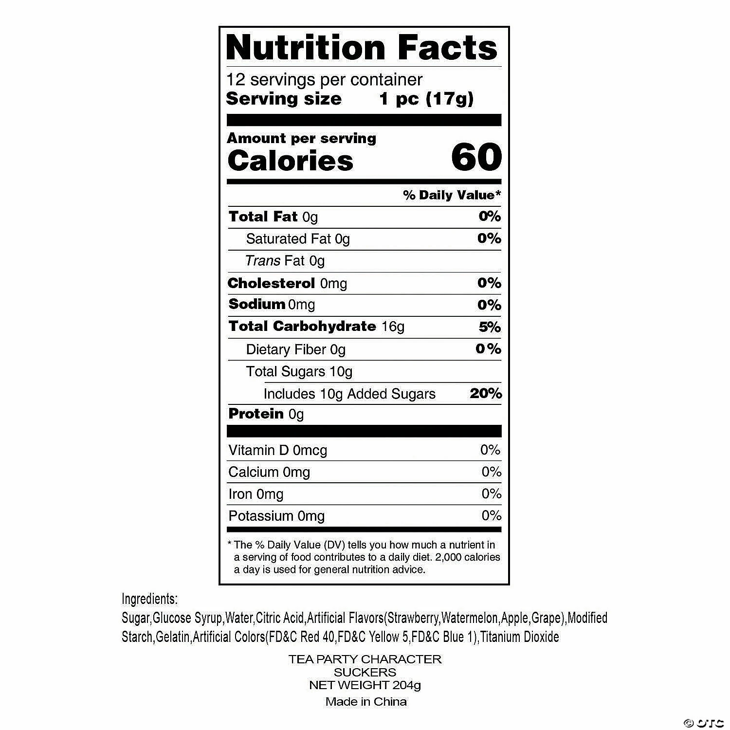 Have a spot of tea! Or perhaps just a tea party sucker! Decorated with bright and girly colors and femine details, these decadent sweets are perfect for a little girl’s birthday party goody bags! You can even feature these lollipops on a candy buffet at a tea party themed bridal shower! These hand-decorated lollipops are works of art, but designs will vary slightly. © OTC• Strawberry, watermelon, apple and grape flavored.• Individually wrapped. • Includes 1 1/2″ suckers on 4″ plastic sticks.• Total wt., 7 oz.• Assortment may vary.• Fat-free. • Candy is non-returnable. For more information, visit our “Return Policy” page located on our website.• Ingredient, nutrition, allergen and other product information are provided on our Web and Mobile sites for reference purpose only, without warranty or representation as to accuracy. Manufacturers adjust their labeling regularly and are solely responsible for the accuracy of the information. For general questions concerning these items, please contact our customer service at 800-228-0475.