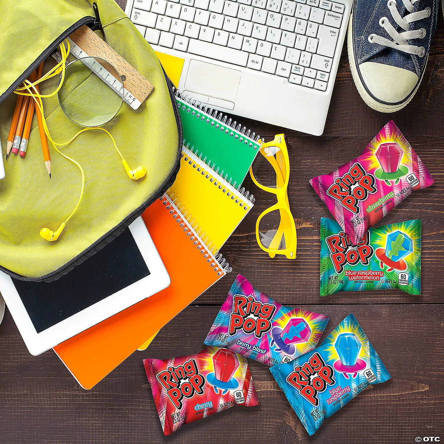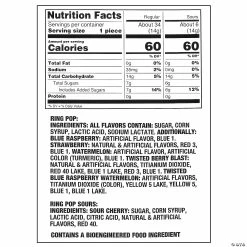 Get your hands on this limited edition mix of Topps Ring Pops® featuring original flavors, sour flavors and fun “twisted” flavor combinations. At only 60 calories per serving, these iconic candies come in a sturdy plastic container that is perfect for the classroom or for handing out to kids as giveaways or prizes. Assorted flavors. Individually wrapped. (50 pcs. per unit) Total wt., 20 oz. Dairy-free. Gluten-free. Kosher. Nut-free.• Made in the USA, Important Country of Origin Information: For certain items sold by Oriental Trading on our Web or Mobile sites, country of origin information can change and what is displayed may not be accurate or consistent with manufacturer information. For up to date country of origin information, it is recommended that you rely on product packaging or other manufacturer information.• Ingredient, nutrition, allergen and other product information are provided on our Web and Mobile sites for reference purpose only, without warranty or representation as to accuracy. Manufacturers adjust their labeling regularly and are solely responsible for the accuracy of the information. For general questions concerning these items, please contact our customer service at 800-228-0475.